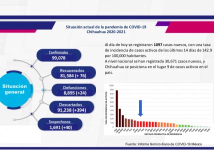 De tal forma, se reporta una tasa de incidencia de casos activos de los últimos 14 días de 142.9 por 100 mil habitantes y a nivel nacional se han registrado 30 mil 671 casos nuevos, de forma que Chihuahua se posiciona en el lugar 9 de casos activos en el país, la cantidad de casos en la entidad ha ido en aumento al igual que en otros estados.