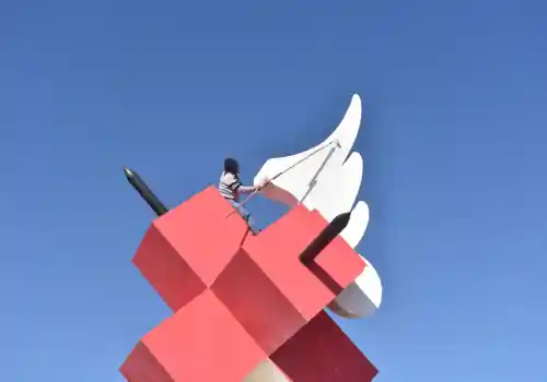 “Esta escultura es representada por varios cubos rojos y una paloma en la parte superior, por lo que las cuadrillas utilizaron pintura roja, blanca y negra para su debida rehabilitación”, dijo.