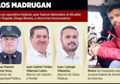 Además de Rivera, fueron capturados ayer Juan Manuel Pérez Sosa, director de Seguridad Pública; Juan Gabriel Toribio Villarreal, director de Catastro y Predial de Tequila. En flagrancia, fue detenido Isaac Carbajal Villaseñor, Director de Obras.