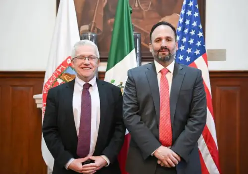 Con el propósito de fortalecer las relaciones internacionales y trabajar en soluciones conjuntas, el secretario general de Gobierno, Santiago de la Peña Grajeda, sostuvo una reunión con el cónsul general de Estados Unidos en Ciudad Juárez, Rafael Foley, y el Jefe Adjunto de Asuntos Políticos del Consulado, Benjamín Kalt.