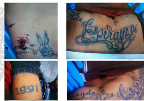 Como señas particulares presenta tatuajes en el cuello con la leyenda “never alon”, en el antebrazo derecho la leyenda “ni la muerte es tan mala ni la vida tan buena”, y en la cadera lado derecho la leyenda “Darwin”.