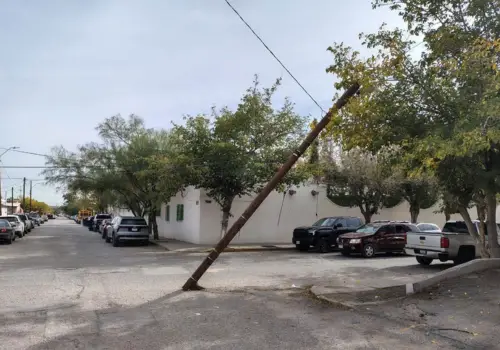 Ciudad Juárez— Un poste de servicios arrancado desde su base y colgando de alambres continúa sin ser reparado, incluso la CFE, Telmex y el municipio rechazaron que sea parte de su infraestructura.