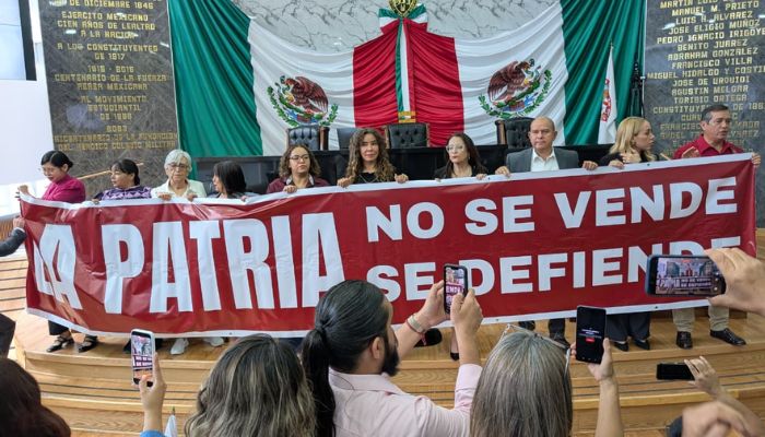 Ante esta situación, integrantes del grupo parlamentario de Morena realizaron una manifestación al interior del recinto, donde desplegaron una lona con la frase “la patria no se vende, se defiende”, en referencia a la polémica por la presunta participación de funcionarios estadounidenses en Chihuahua.